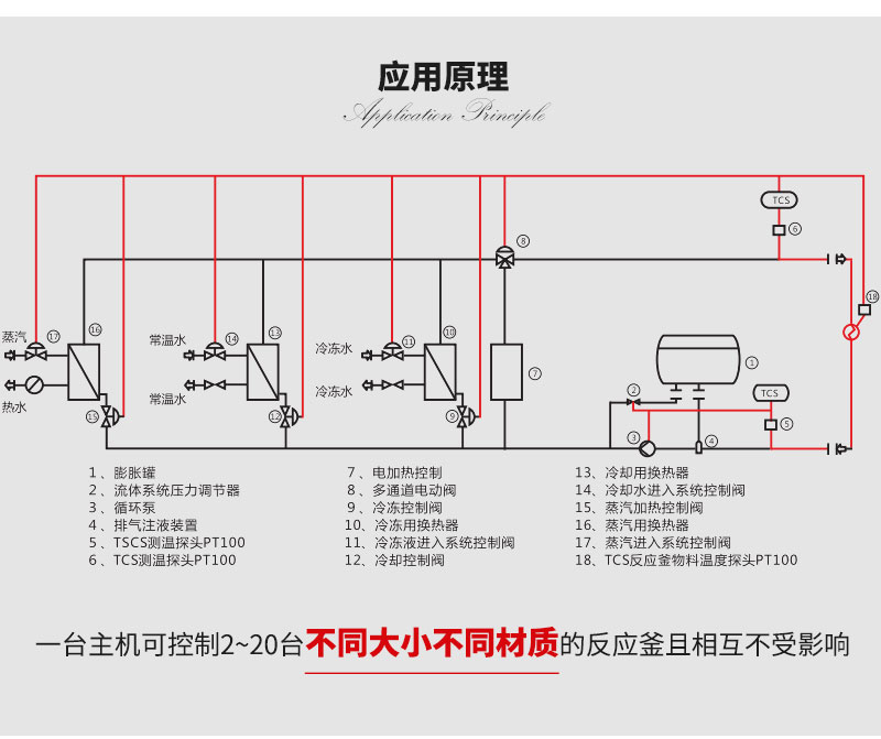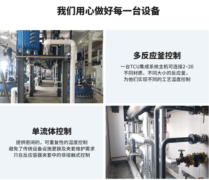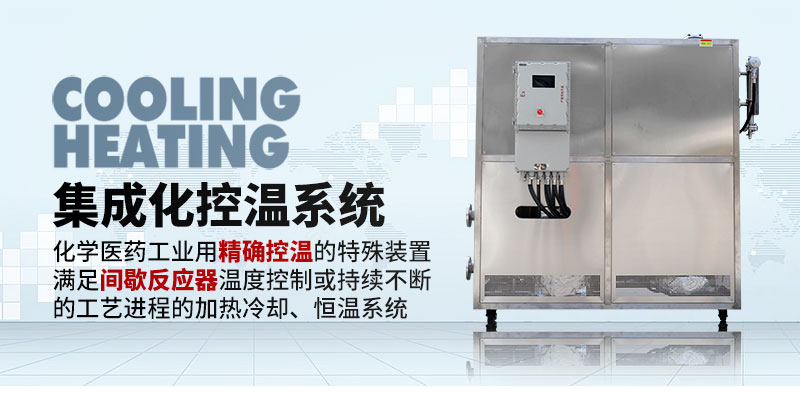 | SR-N | 一組冷卻換熱器,一組加熱換熱器,通過比例調(diào)節(jié)閥控制冷熱量進入到換熱器,再通過統(tǒng)一介質(zhì)輸入到反應釜夾套進行換熱控溫,系統(tǒng)內(nèi)置有膨脹罐 | ||||